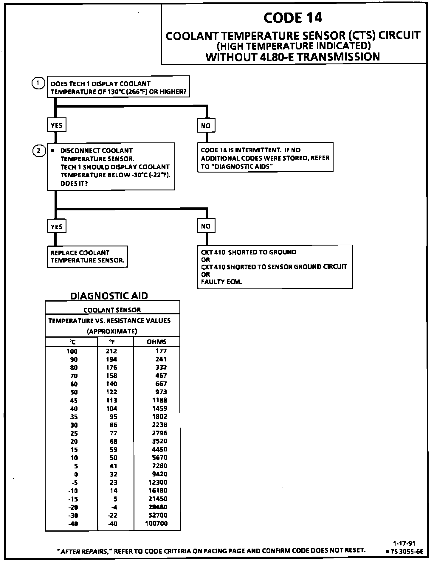 The "Temperature to Resistance Value" scale at the right may be used to test the coolant sensor at various temperature levels to evaluate the possibility of a "skewed" (mis-scaled) sensor. A "skewed" sensor could result in poor driveability complaints.