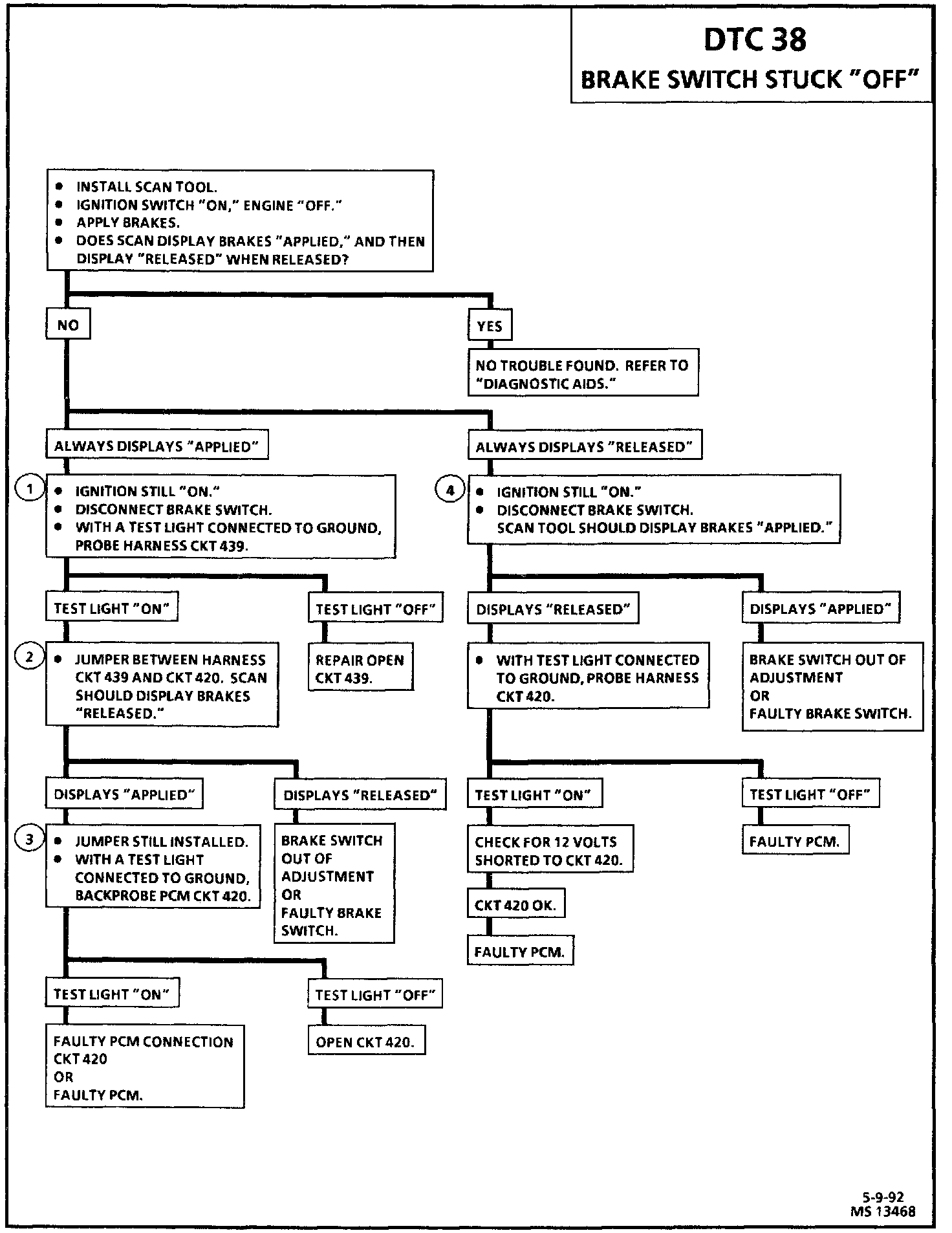 DTC 38 will set when CKT 420 has voltage, vehicle speed is greater than 20 mph for 6 seconds, then between 5 mph and 20 mph for 6 seconds, for a complete total of seven times.