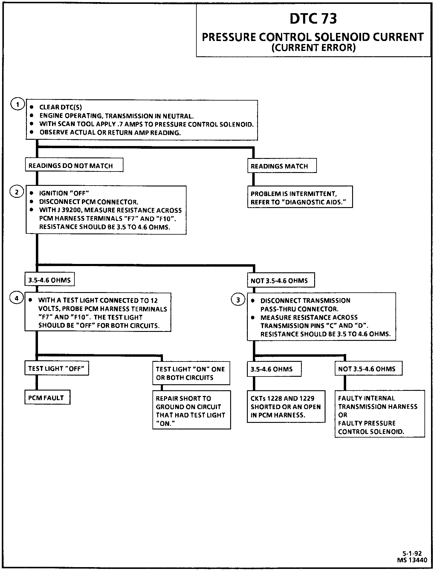The pressure control solenoid is a PCM controlled device used to regulate transmission line pressure. The PCM compares TP voltage, engine rpm and other inputs to determine the line pressure appropriate for a given load. The PCM will regulate the pressure by applying a varying amperage. The applied amperage can vary from 0.1 to 1.1 amp. The PCM then monitors the amperage at the return line. If the return amperage varies greater than 0.16 amp from the commanded amperage for at least one second, DTC 73 will set. When DTC 73 sets, the full line pressure will be applied causing harsh shifts until the next ignition cycle. DTC 73 will remain stored in memory and the pressure control solenoid will resume normal operation until the conditions for DTC 73 re-occur.