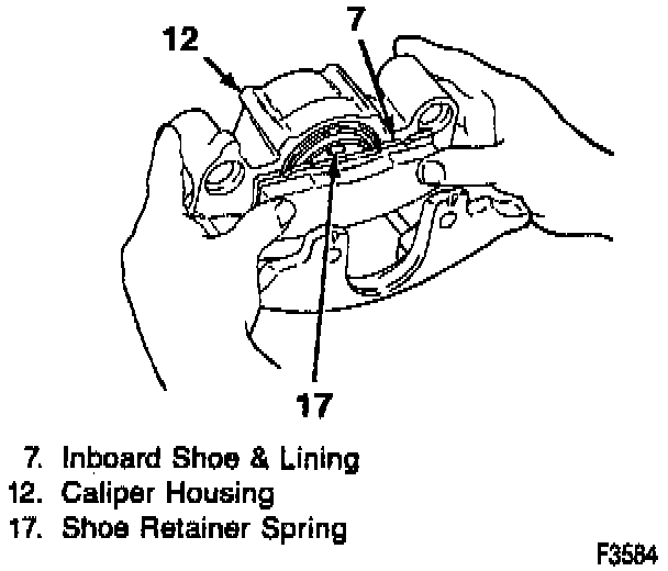 3. Install inner pad by snapping the retainer spring, (staked to the inner pad), into the piston.