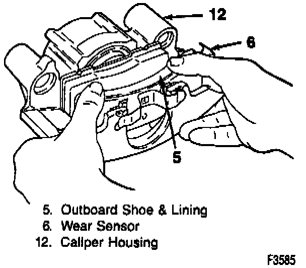 4. Install outer pad with the lining wear indicator at the leading edge of the pad during forward wheel rotation.