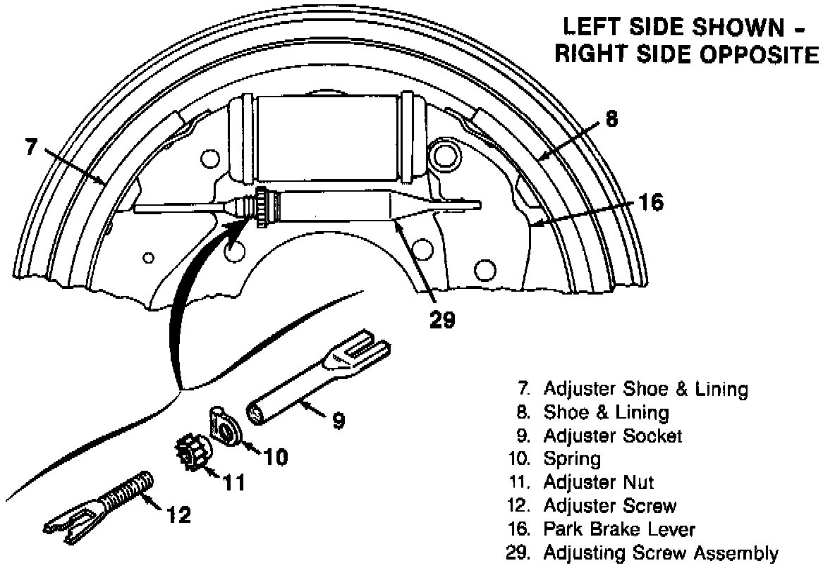 There are two different types of drum brake systems used on C/K trucks Leading/Trailing and Duo Servo. The two systems can be identified without removing the rear wheels by noting the position of the adjustment slot.Exploded View Of Adjusting Screw Assembly: