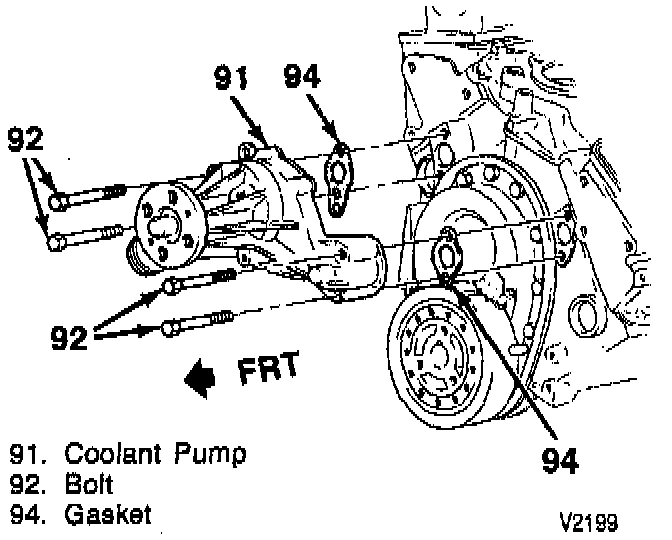 9. Remove coolant pump (91) and gaskets (94) from engine.