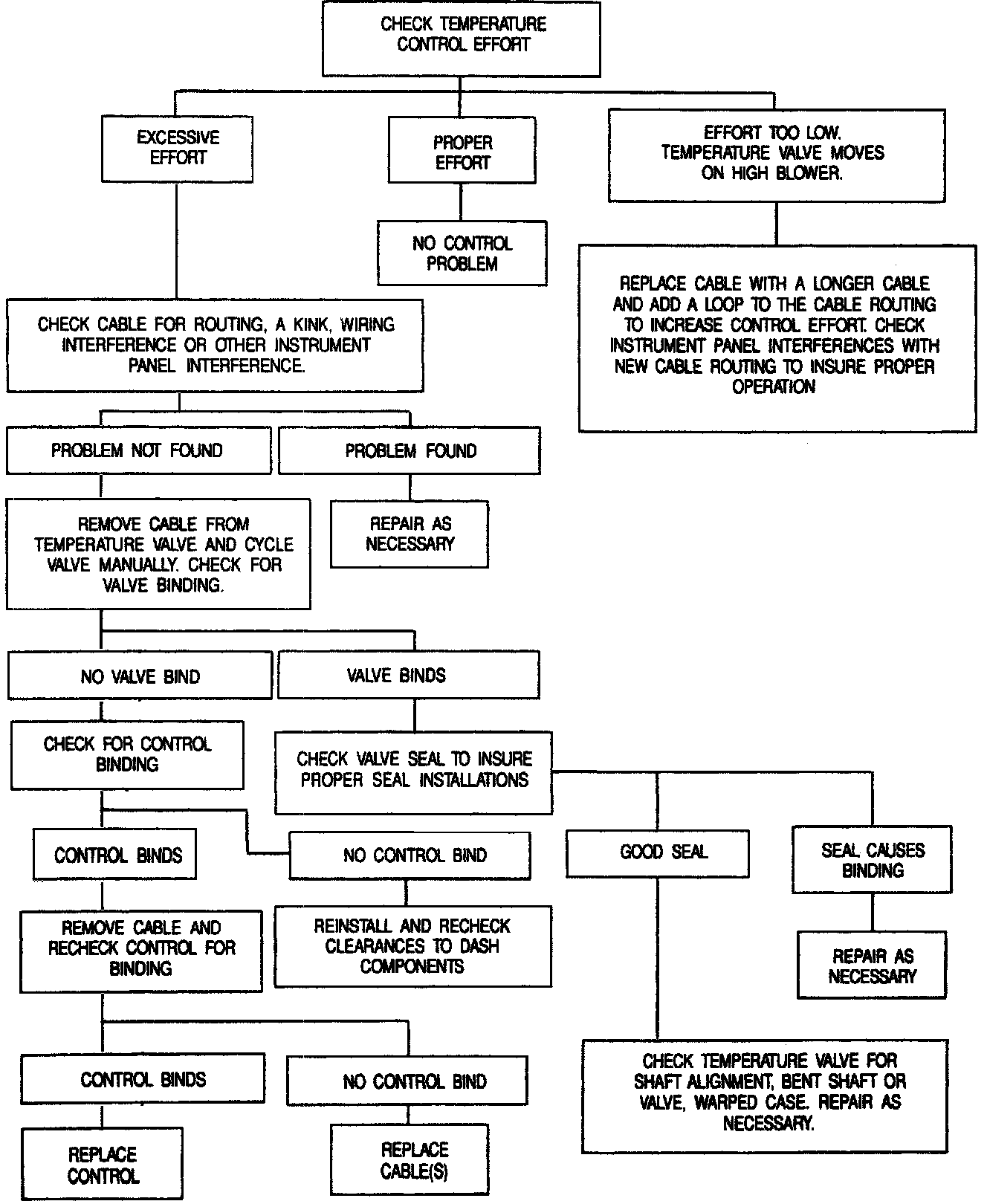 A kinked control cable, a binding valve or a faulty control assembly are possible causes of excessive temperature control lever effort. For an organized diagnosis procedure and an effective "fix" for too little temperature control effort. Refer to Temperature Control Effort.