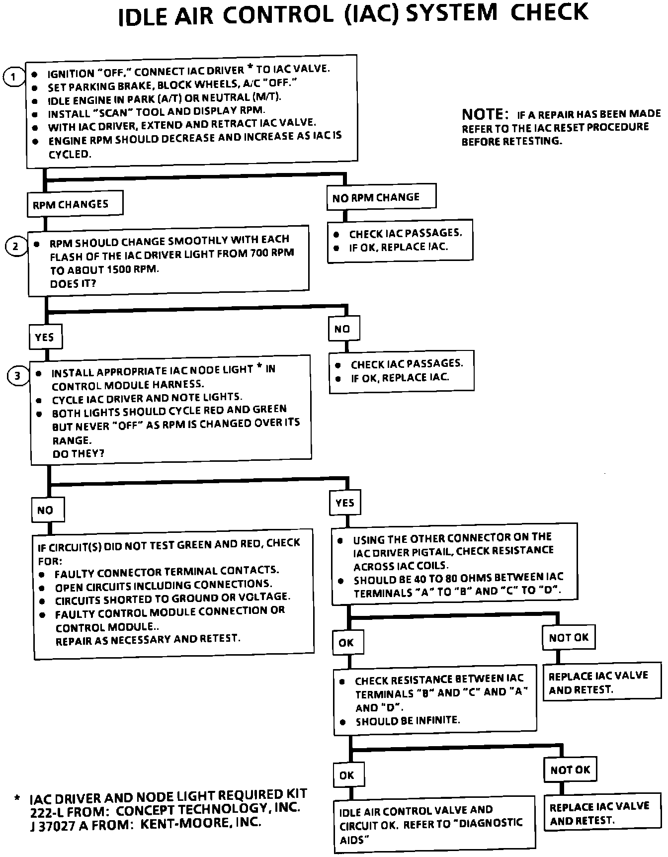 - If intermittent poor driveability symptoms are resolved by disconnecting the IAC, carefully recheck connections, valve terminal resistance, or replace IAC.