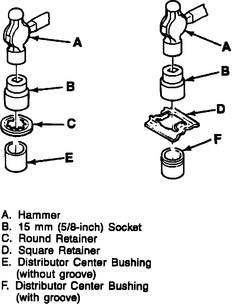Use a new round retainer if center bushing in distributor base has no groove around the outside. Use a new square retainer when there is a groove in center bushing.