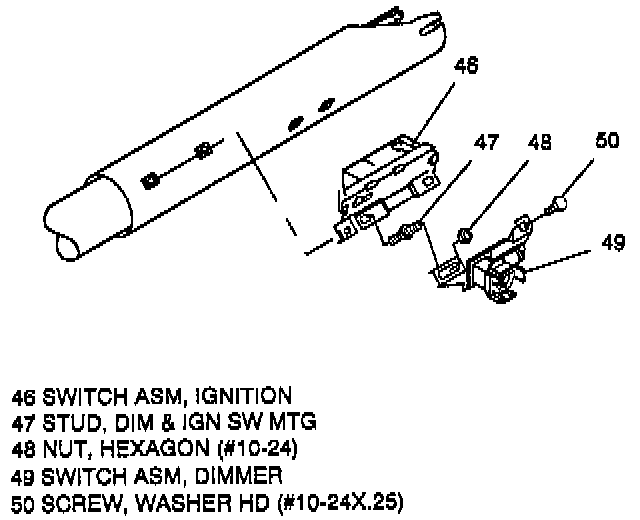 10. Ignition switch assembly (46) and dimmer & ignition switch mounting stud (47).