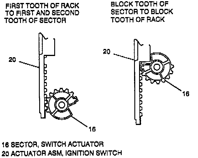 ^ First tooth of actuator rack (20) must interact with first and second tooth of sector (16). With actuator rack (20) fully inserted, block tooth of sector (16) will rest in block tooth of rack (20).