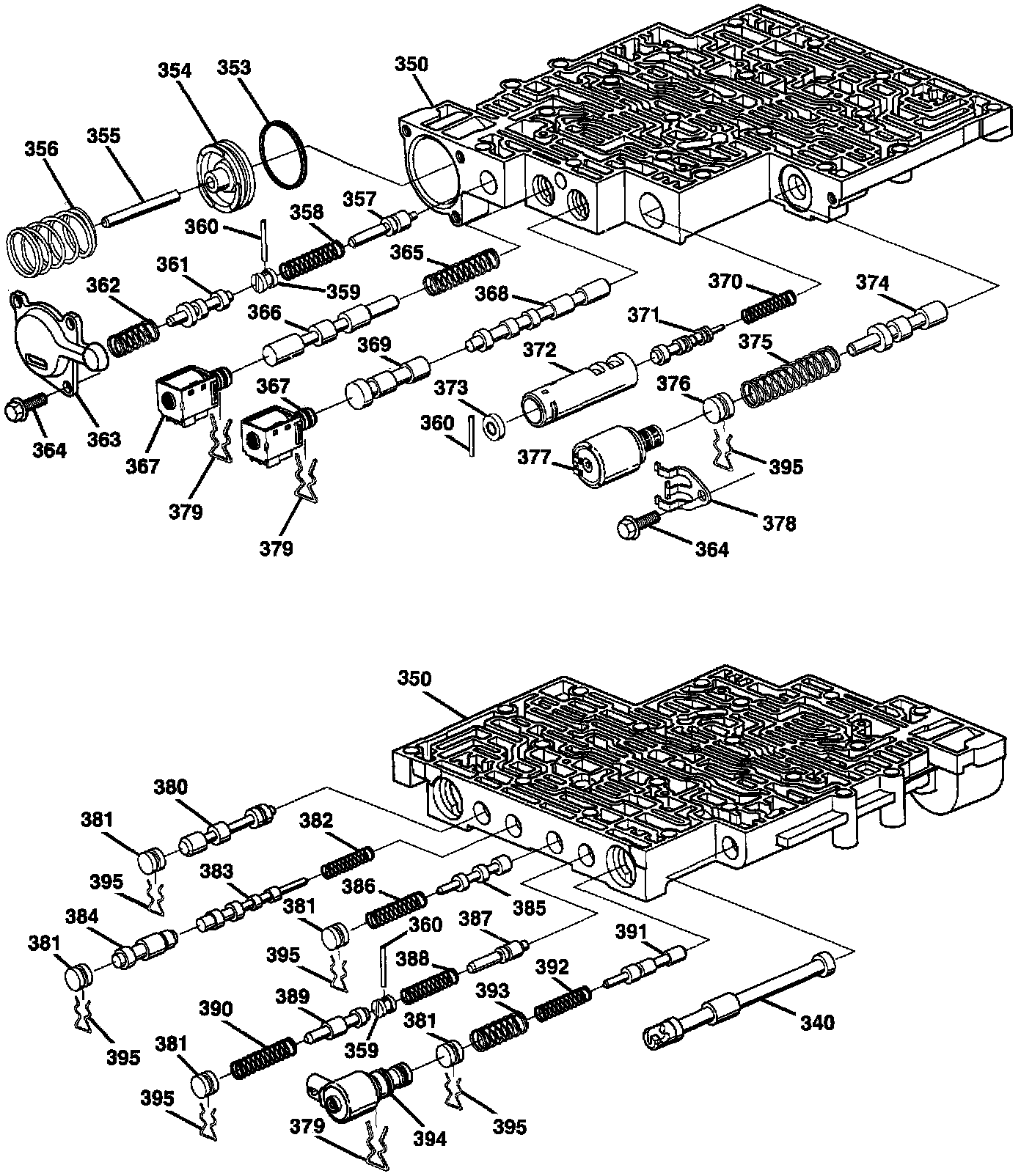 4. Shift solenoid retainer clip (379) and solenoid (367).
