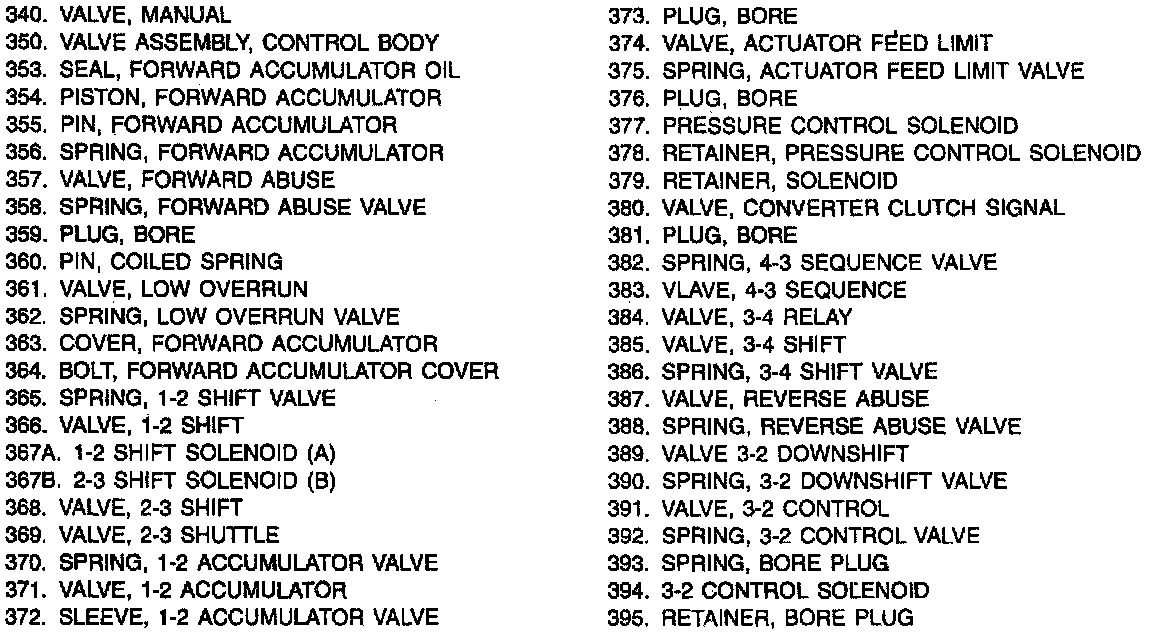 1. Shift solenoid retainer clip (379) and solenoid (367).