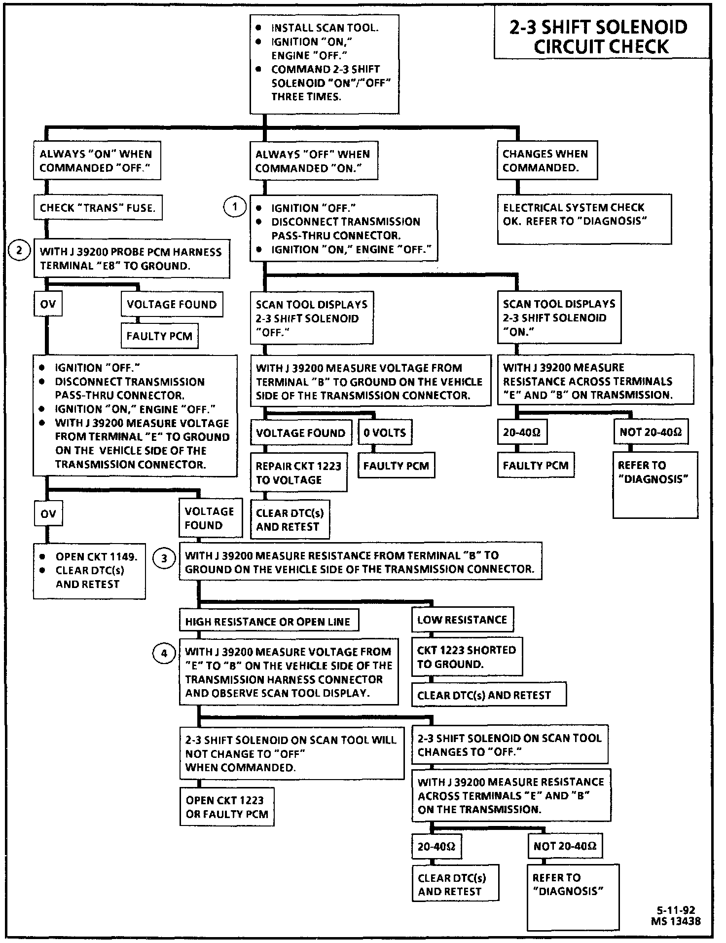 Fused ignition is supplied to 2-3 shift solenoid. The PCM will engage 2-3 shift solenoid by grounding CKT 1223 to energize the solenoid.
