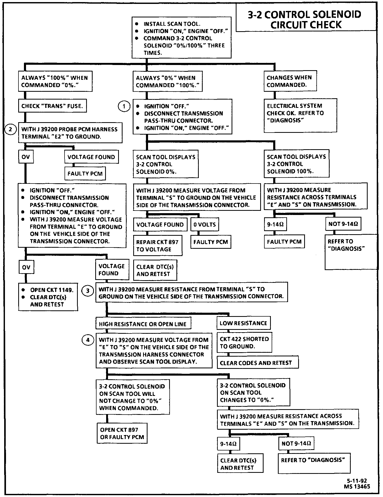 The PCM continually monitors the 3-2 circuit duty cycle depending on the commanded state of the circuit. When the transmission is in first gear the duty cycle of the solenoid is equal to 0. When the transmission is in second or higher the duty cycle of the solenoid will be about 90%. When the transmission downshifts 3-2, the duty cycle of the solenoid will be about 20%.