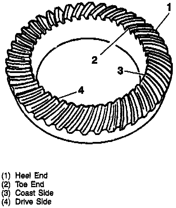 The side of the ring gear tooth which curves outward, or is convex, is referred to as the "drive" side. The concave side is the "coast" side. The end of the tooth nearest the center of ring gear is referred to as the "toe" end. The end of the tooth farthest away from the center is the "heel" end. The toe end of the tooth is smaller than the heel end.