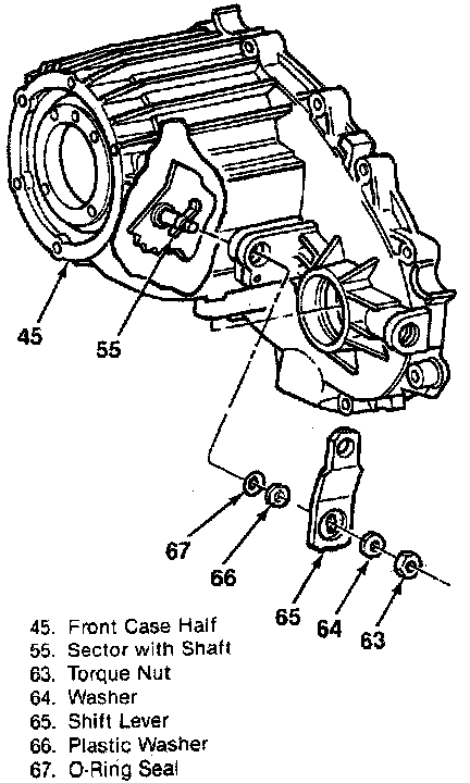8. Shift lever O-ring (67), plastic washer (66), shift lever (65), washer (64), and nut (63) to the front case half (45).