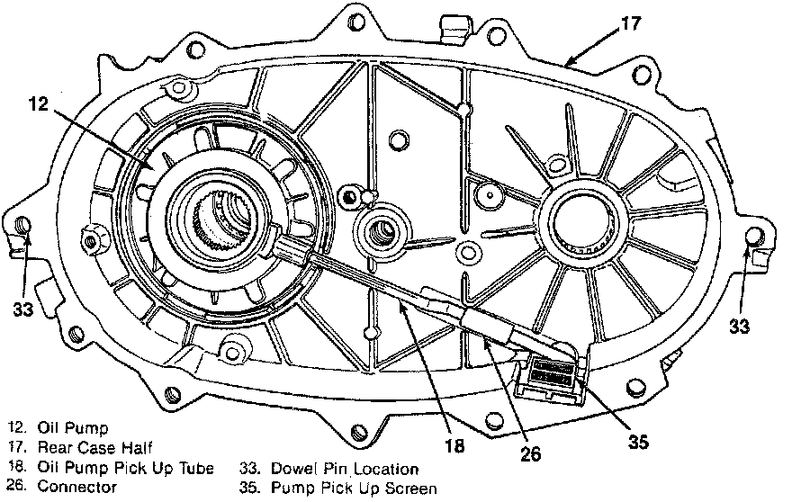 17. Oil pump pick up tube (18), oil tube connector (26), and pump pick up screen (35) into rear case half (17).