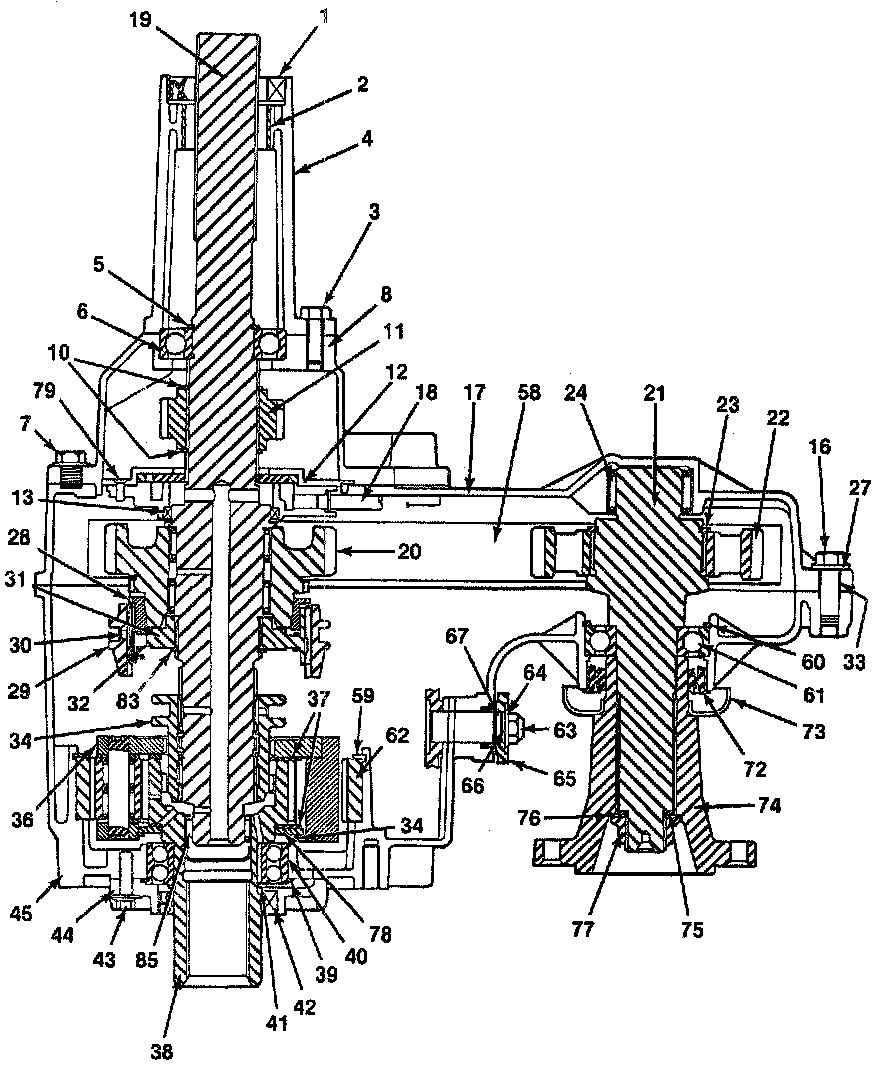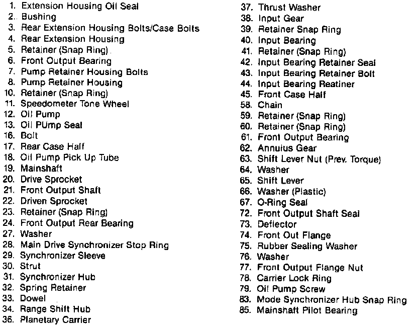 6. Input bearing retainer (44) and input bearing retainer bolts (43) to the front case half (45).