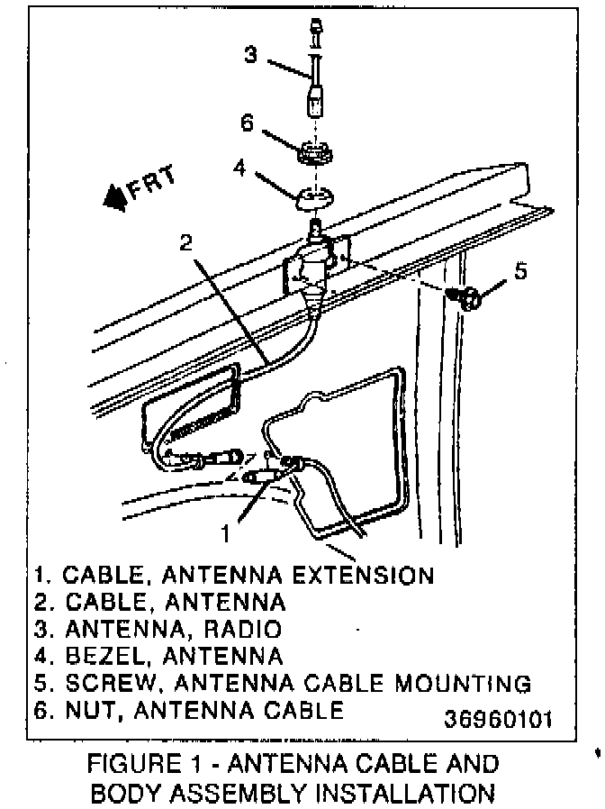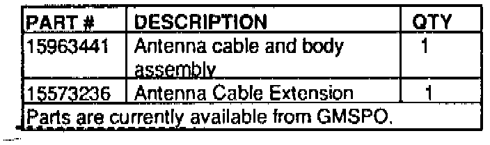 Uncouple the connection where the antenna cable and antenna cable extension meet (Figure 1). Check for the presence of moisture, corrosion, or other signs of water intrusion. If there is any sign of moisture at the connector, replace the antenna cable and body assembly (P/N 15963441). It water intrusion is present, it will also be necessary to replace the antenna extension cable between the antenna body terminal and radio receiver. (See Figures 1 and 2.)