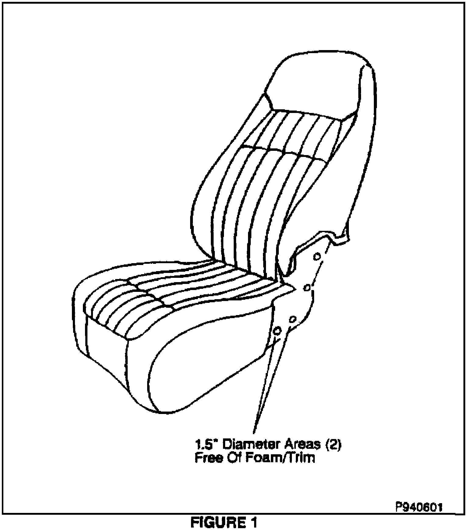 10. Inspect for trapped foam/material under the recliner mechanism in the lower bolt locations. While foam/material in the threads is irrelevant, there should be a 1.5" diameter hole in the seat cushion material under the recliner mechanism to insure good metal-to-metal contact (Figure 1).
