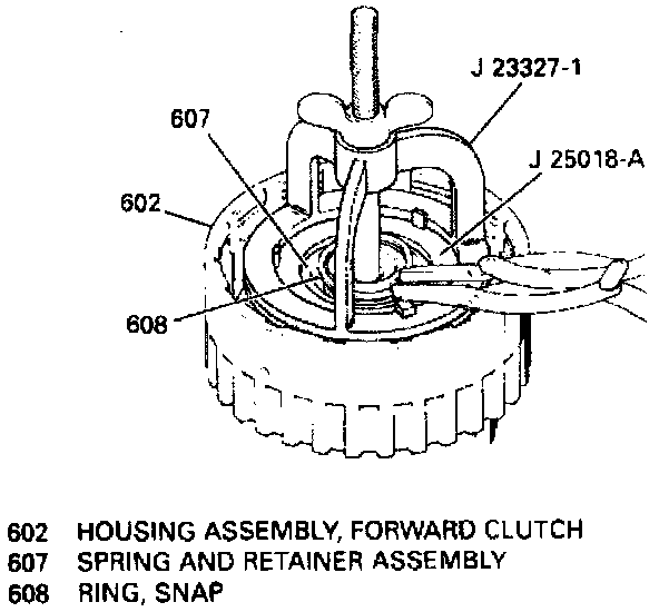 4. Remove snap ring, spring and retainer assembly using spring compressor tool No. J-23327 or equivalent, per figure.