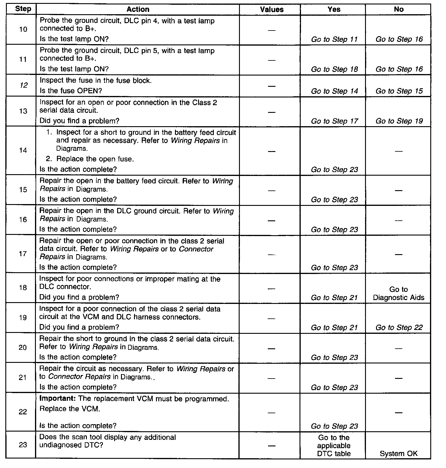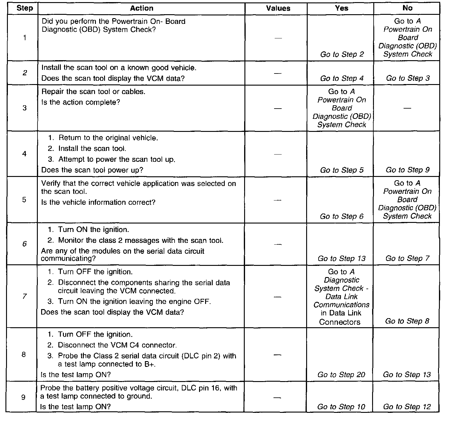 The class 2 serial data circuit to the DLC allows bi-directional communication between the VCM and the scan tool. This is accomplished through pin 2 of the DLC. If communication between the scan tool and the VCM cannot be established, the procedure in the DLC diagnosis table should be used to diagnose the condition.