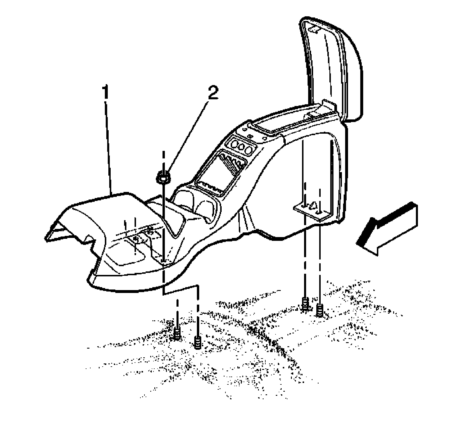 6. Remove the fasteners (2) that retain the console (1) to the shifter assembly and the vehicle floor.