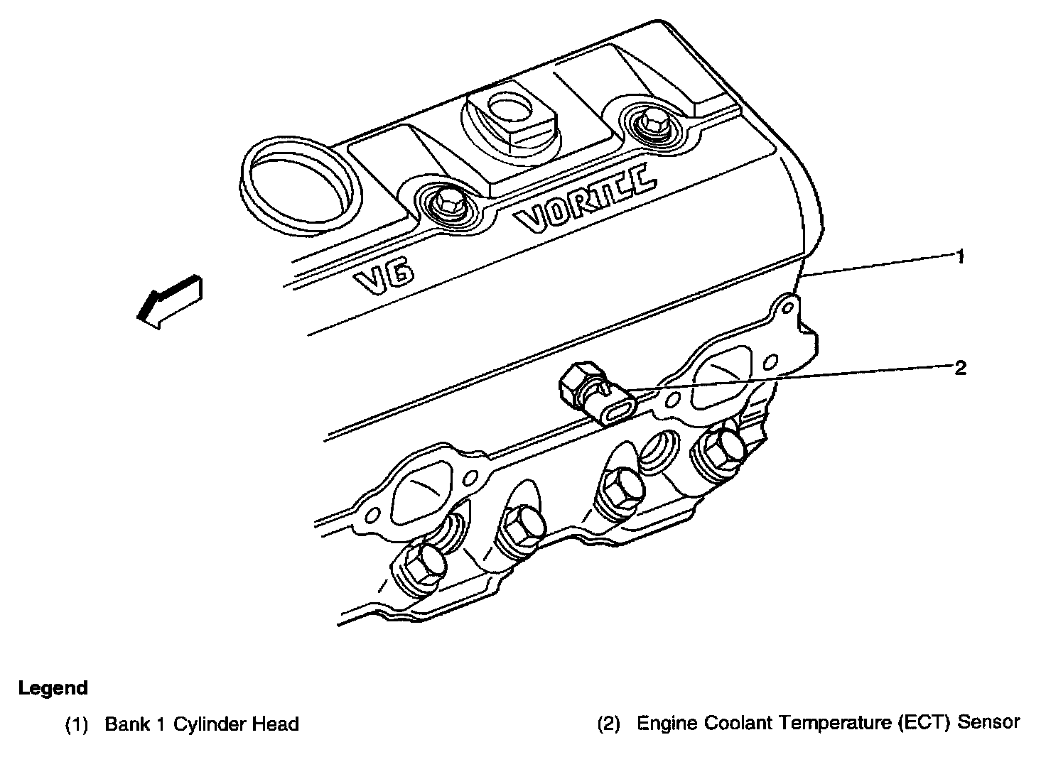 Near the front of the left cylinder head, in front of the exhaust manifold
