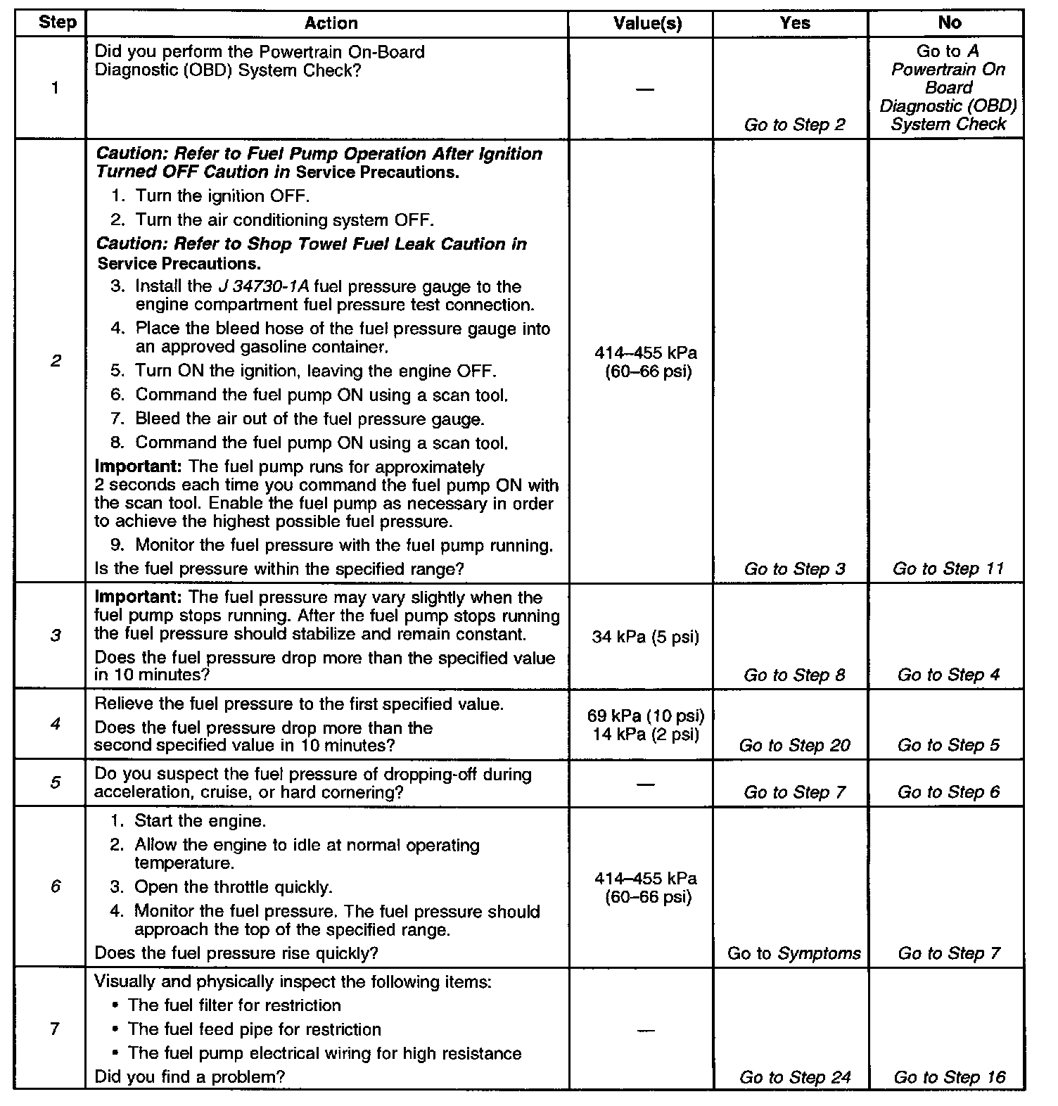 4. A fuel system that drops more than 14 kPa (2 psi) in 10 minutes after being relieved to 69 kPa (10 psi) indicates a leaking fuel pump check valve.