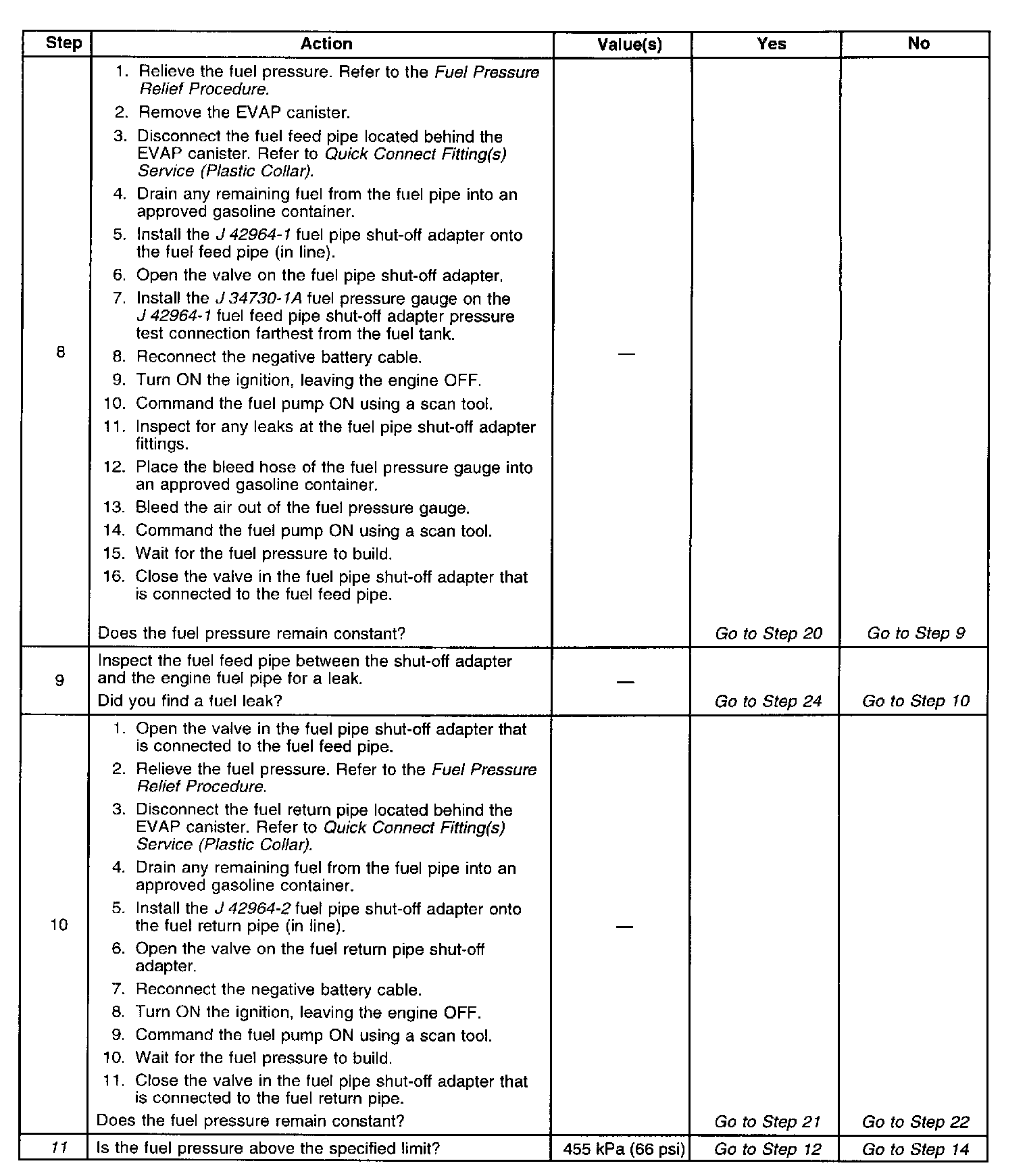15. Restricting the fuel return pipe with the J 42964-2 fuel pipe shut-off adapter causes the fuel pressure to rise above the regulated fuel pressure. Using a scan tool to pressurize the fuel system, the fuel pressure should rise above 455 kPa (66 psi) as the valve on the fuel pipe shut-off adapter connected to the fuel return pipe becomes partially closed.