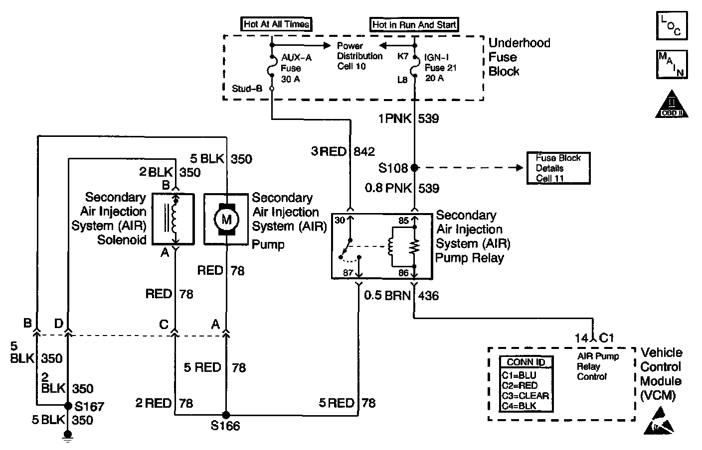 A fused ignition voltage is supplied to the AIR pump relay. The Vehicle Control Module (VCM) controls the AIR pump by grounding the AIR pump relay control circuit. This energizes the relay and supplies voltage to the AIR pump and the AIR solenoid. When the fuel system goes into Closed Loop, the VCM opens the ground to the AIR control circuit.