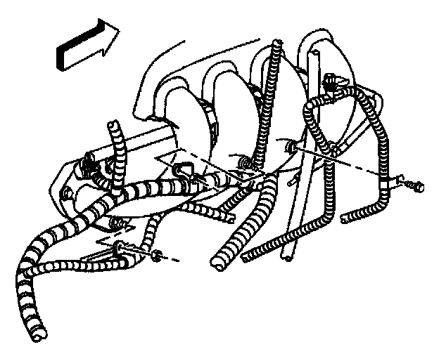 14. Remove the nut holding the engine wiring harness clip to the intake manifold rear lower stud.