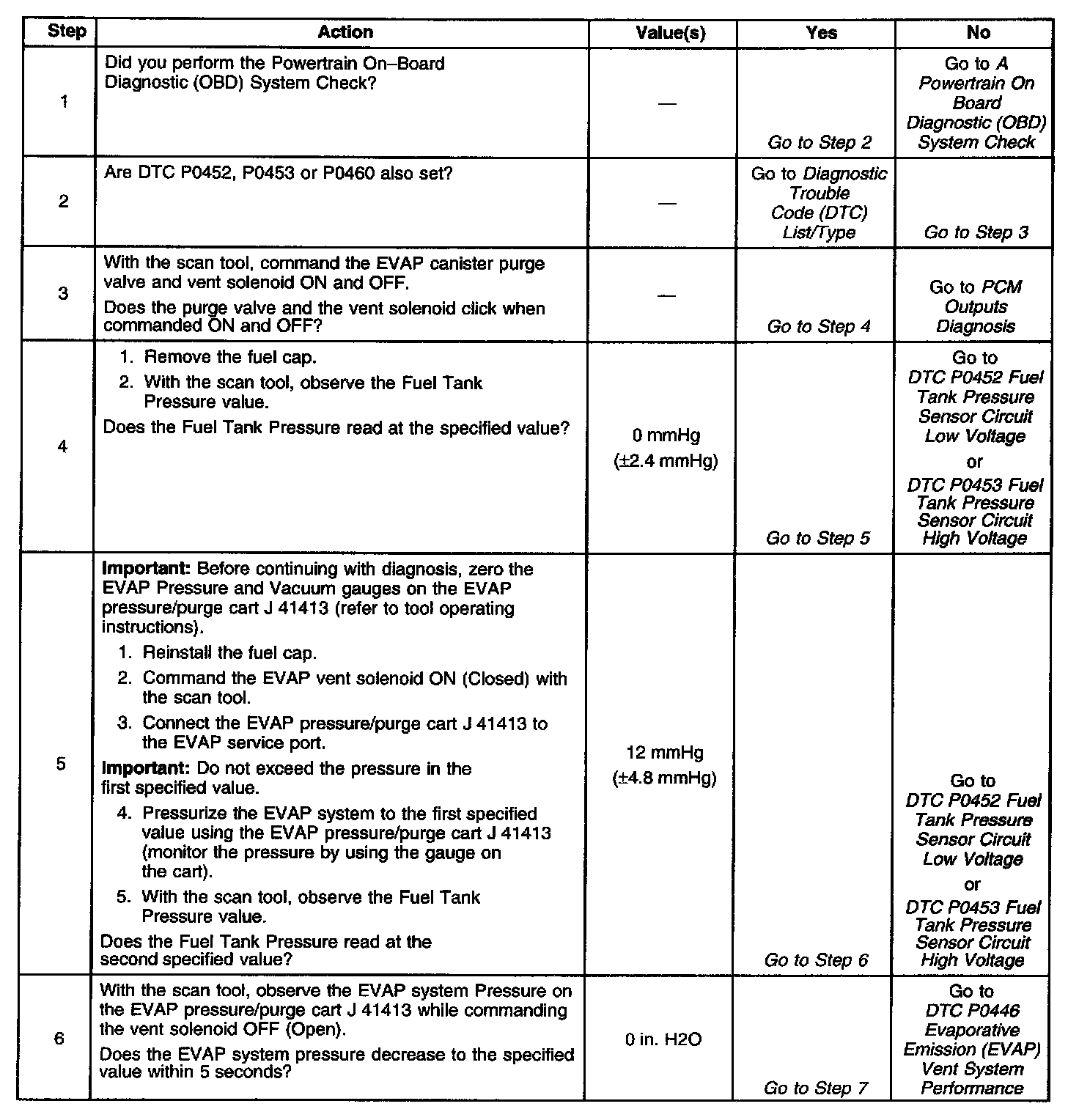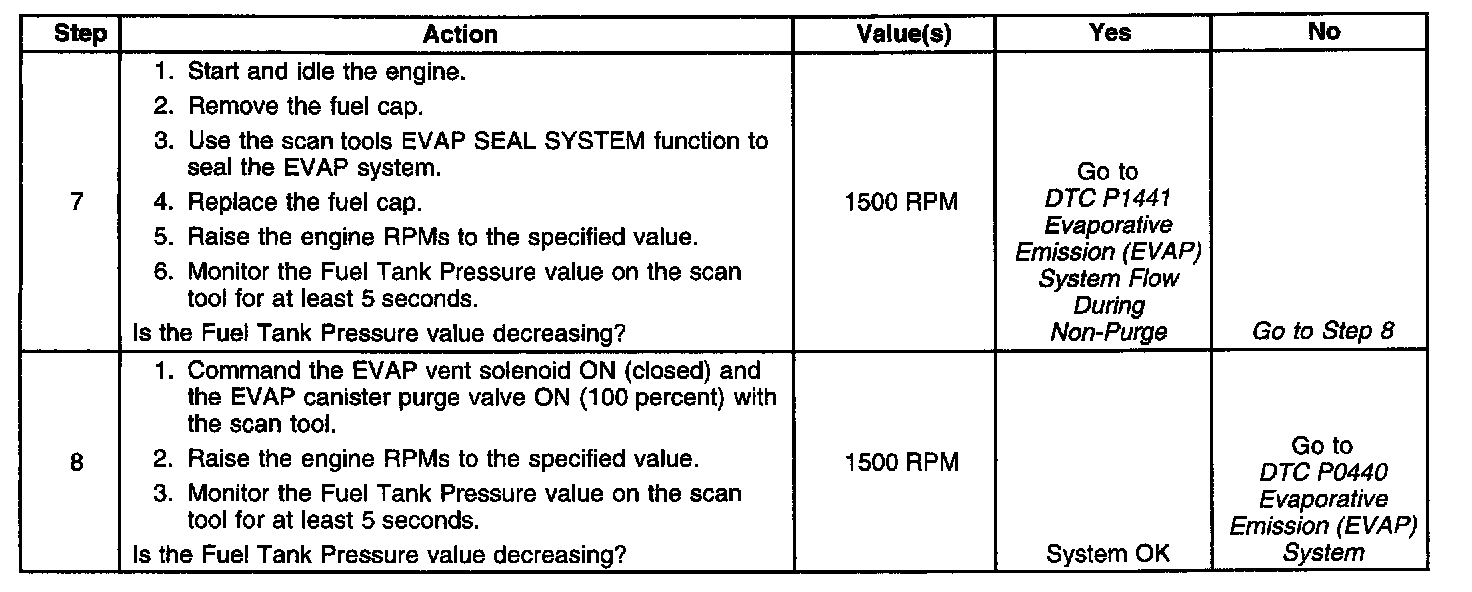 Applying a vacuum to the EVAP system and monitoring for a vacuum decay checks the evaporative emission system. The control module monitors the vacuum level through the fuel tank vacuum sensor signal. At an appropriate time, the EVAP canister purge valve and the [1][2]EVAP vent solenoid turn ON, allowing the engine to draw a small vacuum on the entire evaporative emission system. After the desired vacuum level has been achieved, the EVAP canister purge valve turns OFF, sealing the system. A leak is detected by monitoring for a decrease in the vacuum level over a given time period; when all other variables remain constant. A leak, a blockage or a malfunctioning component in the system causes a DTC to set.