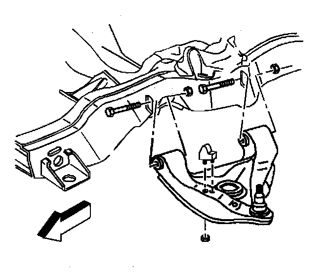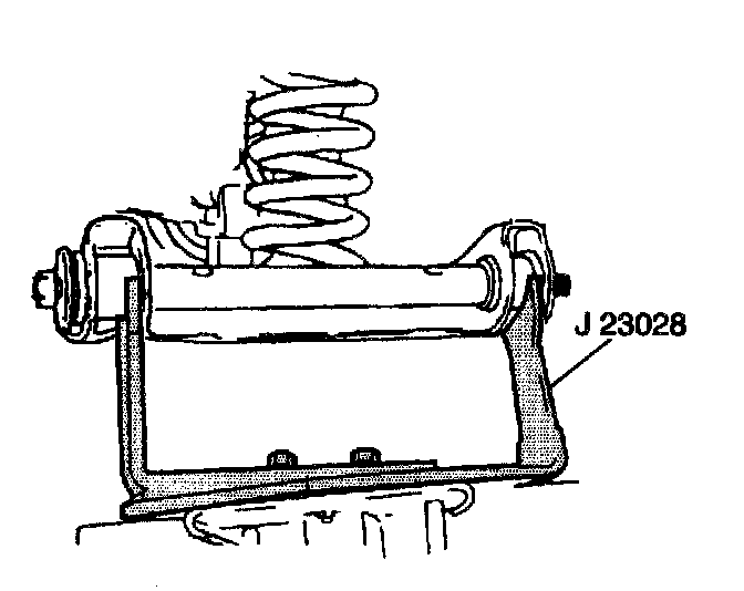 Use the J 23028-01 and a floor jack in order to position the lower control arm underneath the frame.