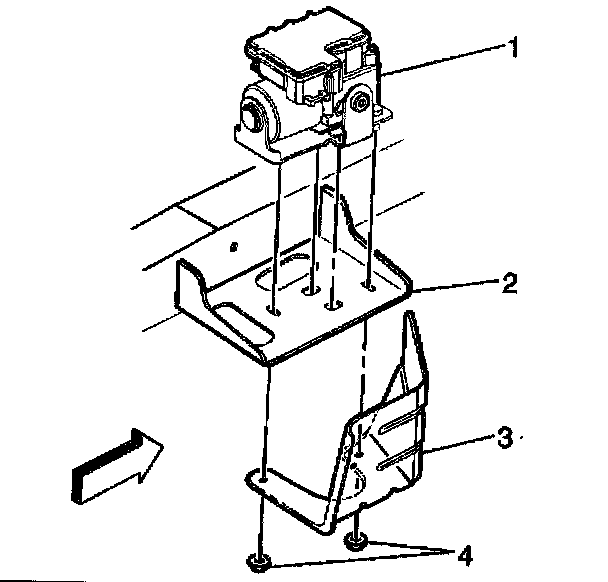 4. Secure the module (1) to the frame bracket (3) and fuel pipe shield (2) with the two nuts (4).