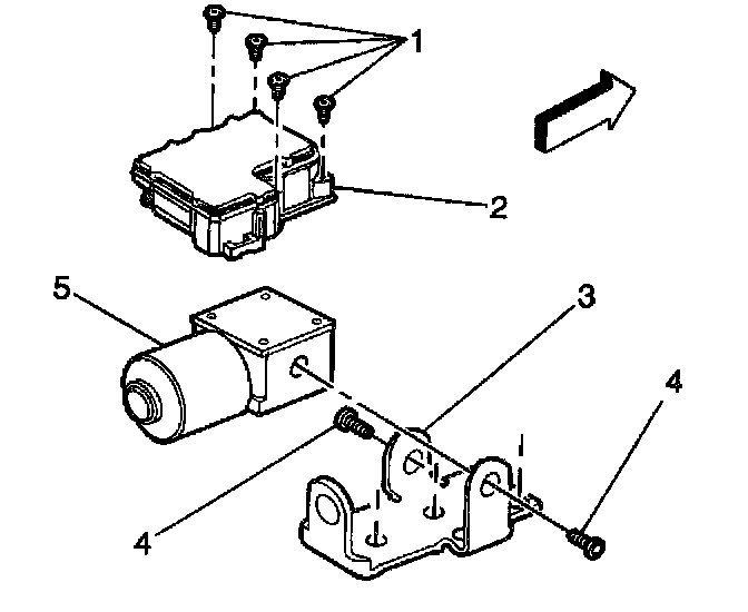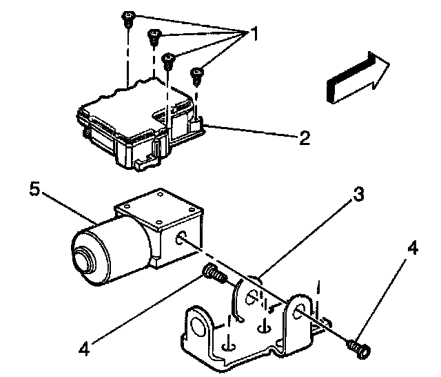 3. Remove the four T 25 Torx mounting screws (1) that fasten the EBCM (2) to the BPMP (5).