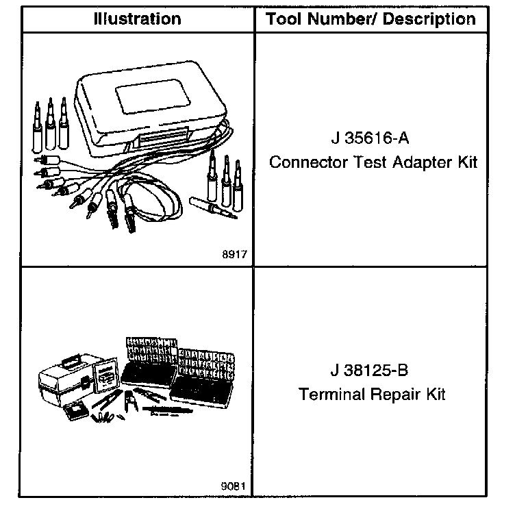 Use the J 35616-A Connector Test Adapter Kit whenever a diagnostic procedure requests checking or probing a terminal. Using the appropriate adapter will ensure that no damage to the terminal occurs from the DMM probe, such as spreading or bending. The adapter will also give an idea of whether contact tension is sufficient, helping to find an open or intermittent open due to poor terminal contact.