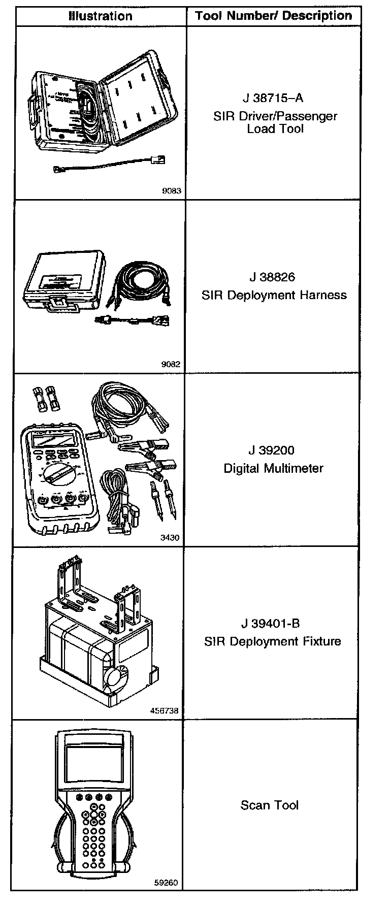 Use the J 38715-A SIR Driver/Passenger Load Tool only when the SIR diagnostics require the tool. The Load Tool is used as a diagnostic aid and a safety device in order to prevent inadvertent inflator module deployment.