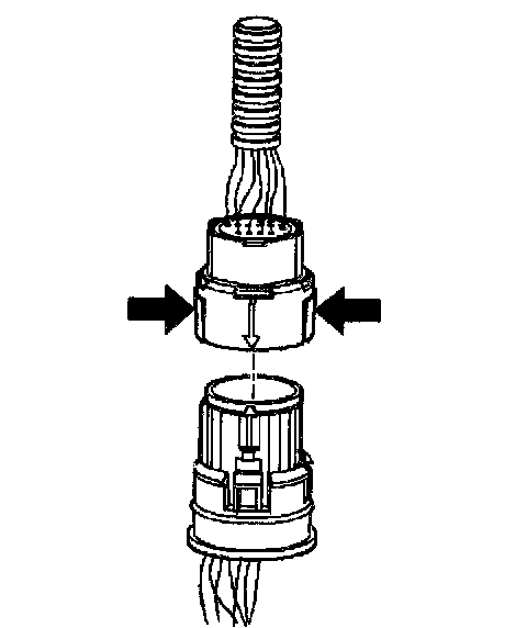 ^ In order to reinstall the external wiring connector, first orient the pins by lining up the arrows on each half of the connector. Push the connector straight down into the transmission without twisting or angling the mating parts.