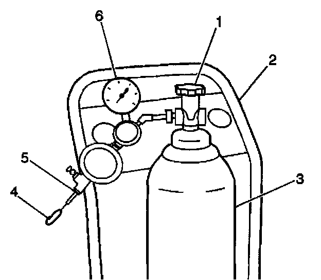 6. Disconnect the black hose (4) that connects the nitrogen cylinder to the J 41413 [1][2]EVAP pressure/purge diagnostic station at the pressure regulator (5) by unscrewing the knurled nut on the pressure regulator.