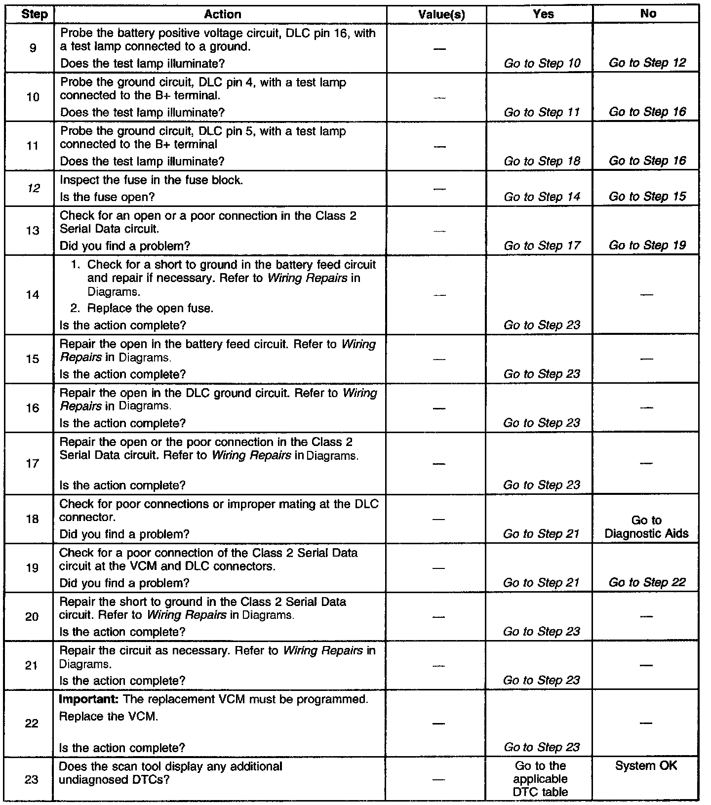 The Class 2 Serial Data circuit to the DLC allows bi-directional communication between the Vehicle Control Module (VCM) and the scan tool. This is accomplished through pin 2 of the DLC. If communication between the scan tool and the VCM cannot be established, the procedure in the DLC Diagnosis table should be used to diagnose the condition.