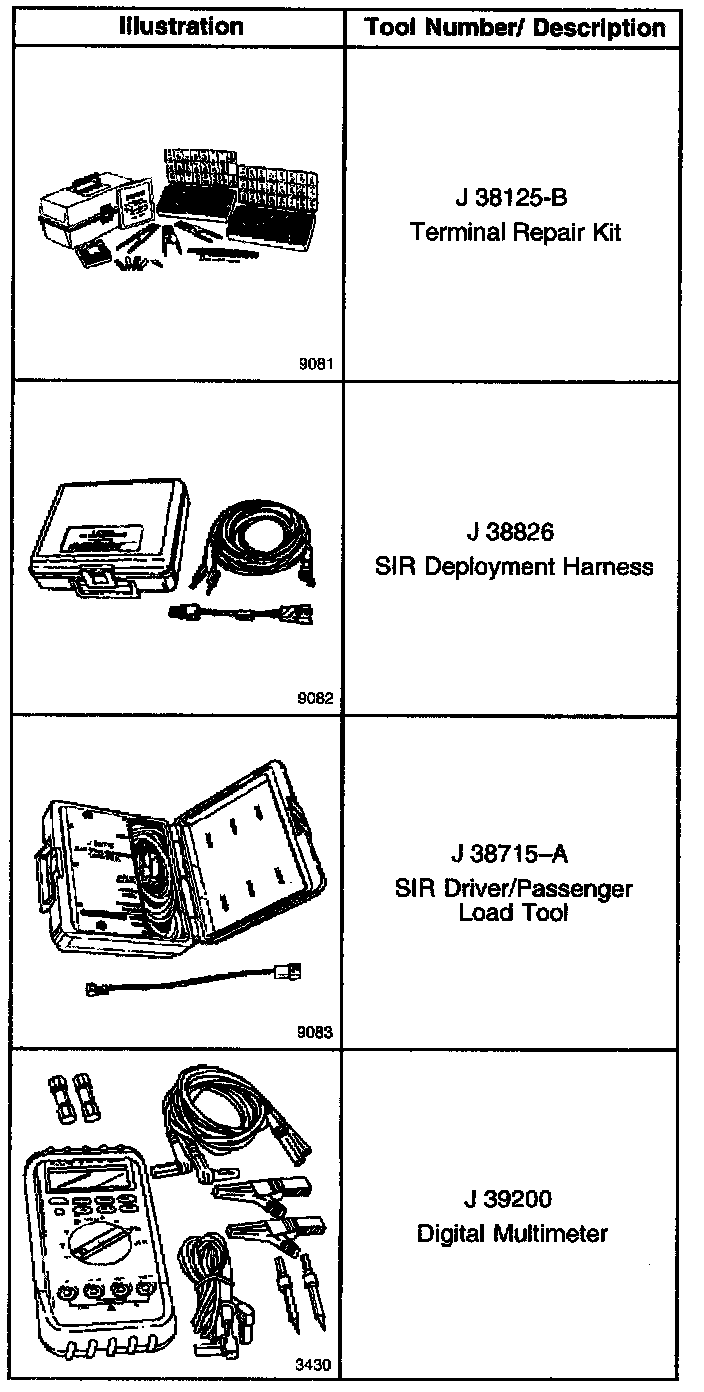 Use the J 38125-B Terminal Repair Kit for SIR wiring repair. This kit contains a special crimping tool, heat torch, and sealed splices. Do not use the terminals in the kit in order to replace damaged SIR system terminals unless specifically indicated by the terminal package.