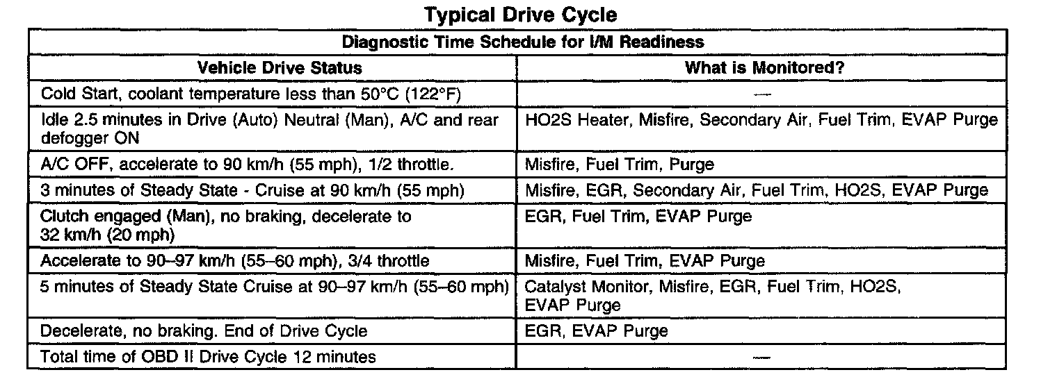 IMPORTANT: The System Status display indicates only whether or not the test has been completed. The System Status display does not necessarily mean that the test has passed. If a Failed Last Test indication is present for a DTC associated with one of the above systems, diagnosis and repair is necessary in order to meet the I/M requirement. Verify that the vehicle passes all of the diagnostic tests associated with the displayed System Status prior to returning the vehicle to the customer. Refer to the Typical Drive Cycle table, more than one drive cycle may be needed, to use as a guide to complete the I/M System Status tests.