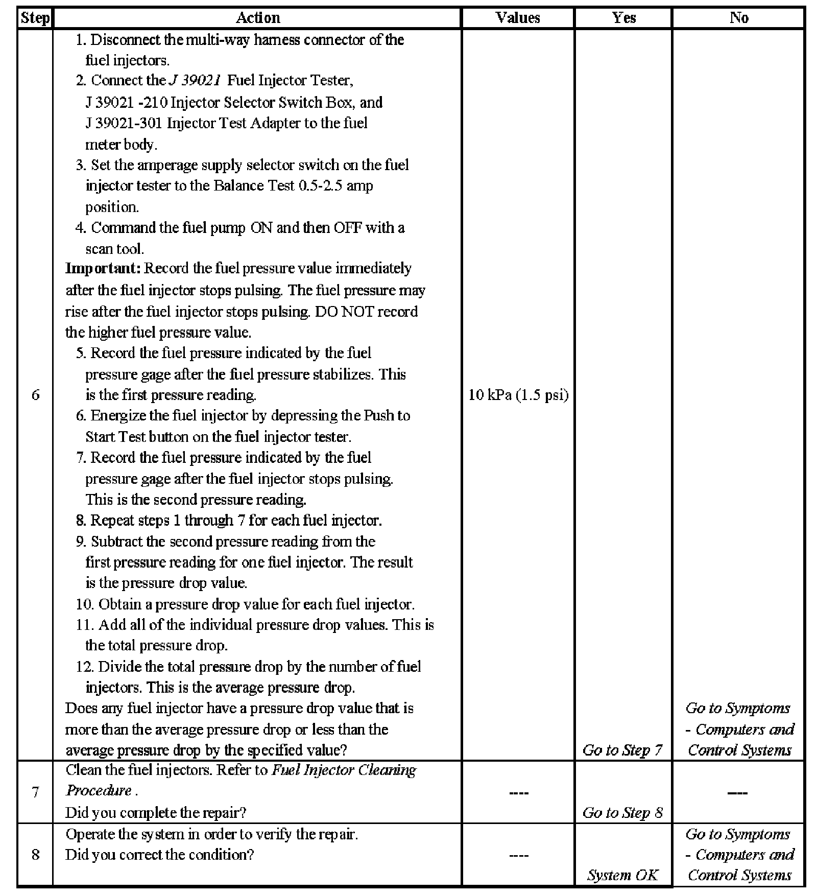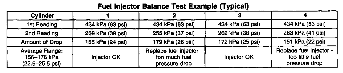 6. If the pressure drop value for each fuel injector is within 10 kPa (1.5 psi) of the average pressure drop value, the fuel injectors are flowing properly. Calculate the pressure drop value for each fuel injector by subtracting the second pressure reading from the first pressure reading. Refer to the Fuel Injector Balance Test Example.