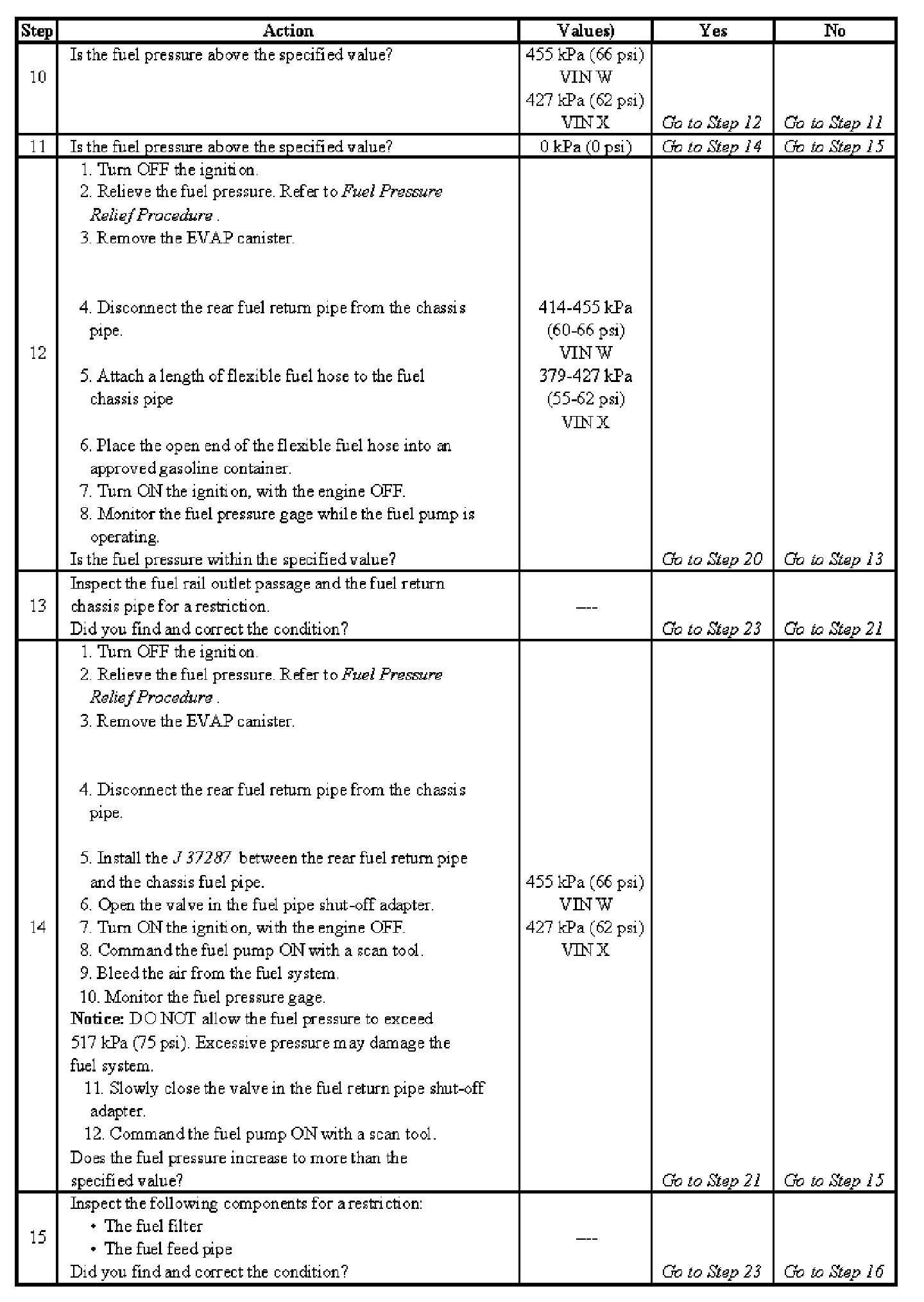 12. This step tests for a restricted fuel return pipe. If the fuel pressure is within the specified values, a restriction in the fuel return pipe is indicated.