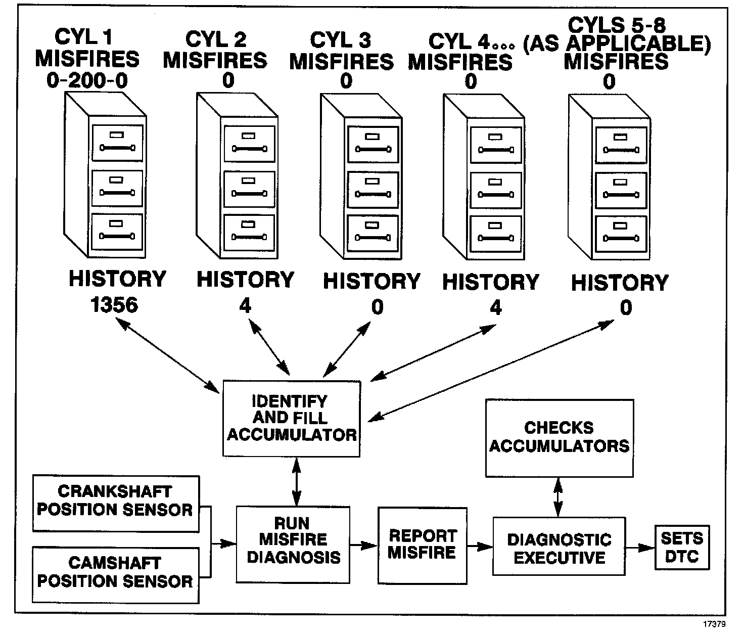 Whenever a cylinder misfires, the misfire diagnostic counts the misfire and notes the CKP at the time the misfire occurred.