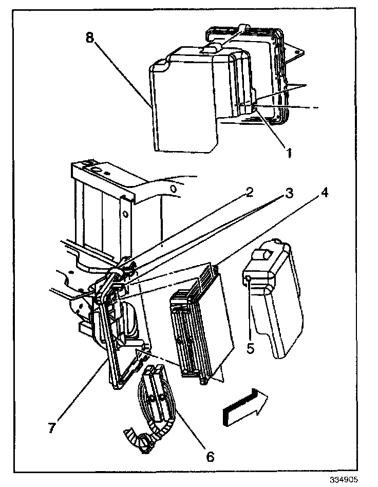 4. Install the PCM cover (8) to the PCM mounting bracket (7), ensuring the mounting tabs on the PCM mounting bracket are engaged into the mounting holes in the PCM cover.