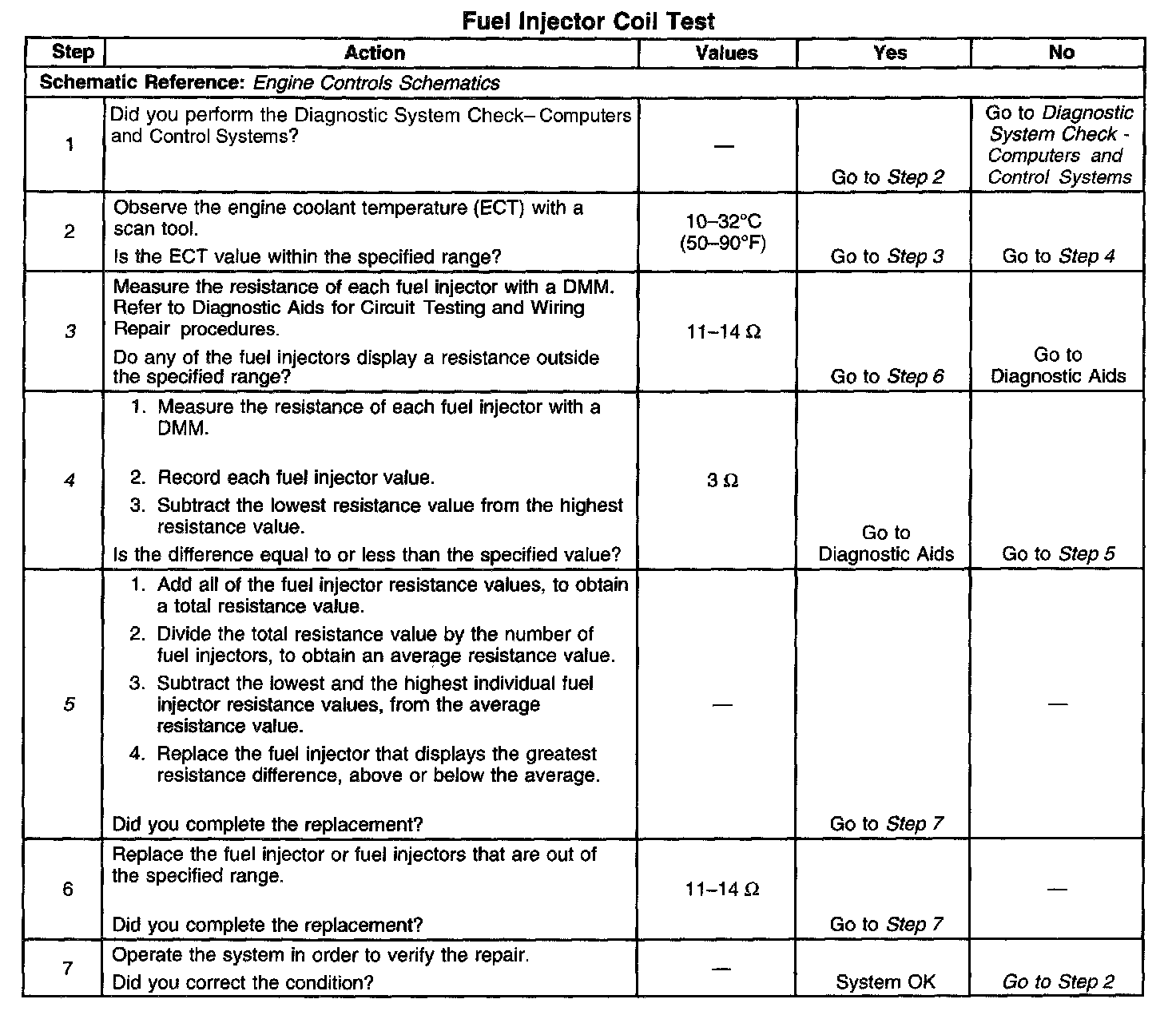 3. This step tests each fuel injector resistance within a specific temperature range. If any of the fuel injectors display a resistance outside of the specified value, replace the fuel injector.
