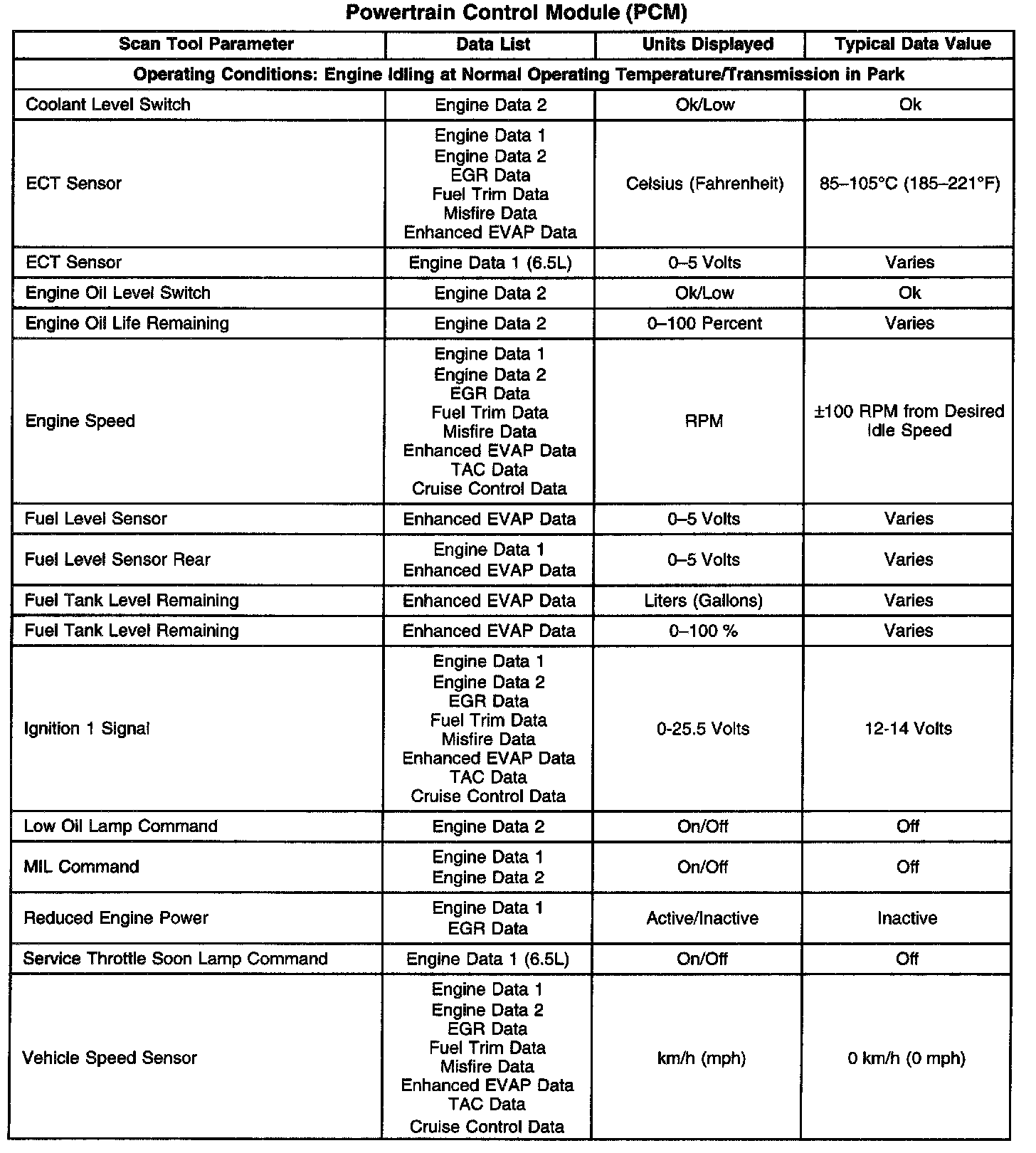 Scan Tool Data List - Powertrain Control Module (PCM)