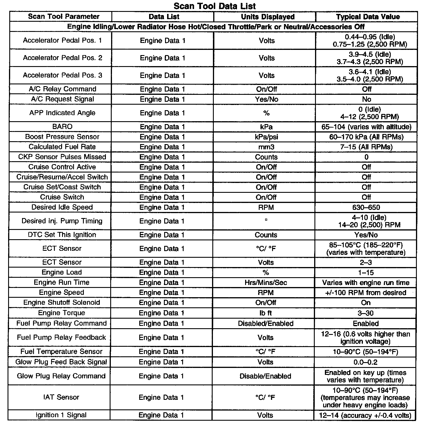 Use only the parameters listed in the tables for diagnosis. If a scan tool reads other parameters, the values are not recommended by General Motors for use in diagnosis. For more description on the values and the use of the scan tool diagnosis the PCM inputs, refer to the applicable diagnosis. If all values are within the range illustrated, refer to Driveability Symptoms.