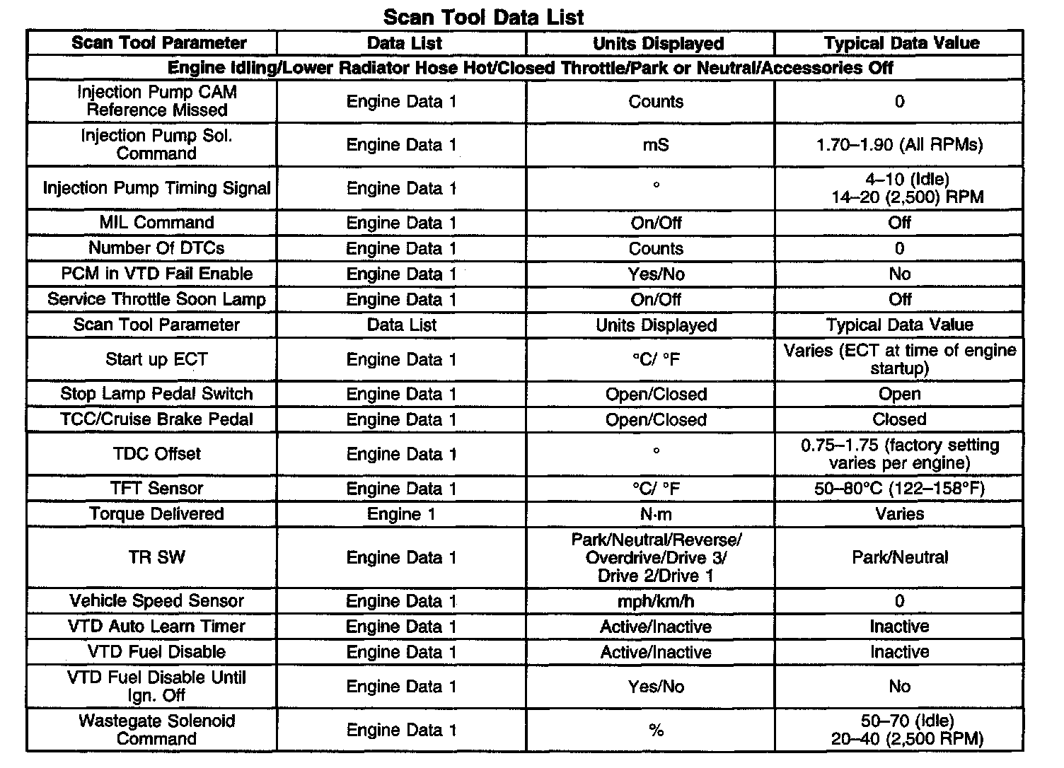 Use the scan tool data listed in this table for comparison after the On-Board Diagnostic system check and finding the on-board diagnostics function properly with no diagnostic codes displayed.