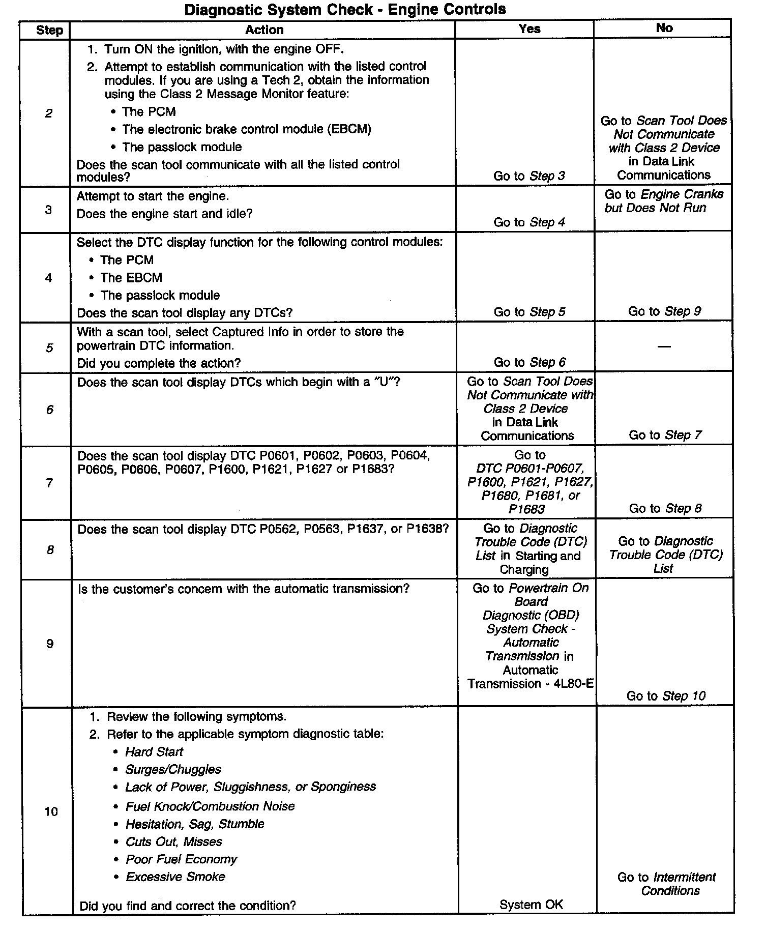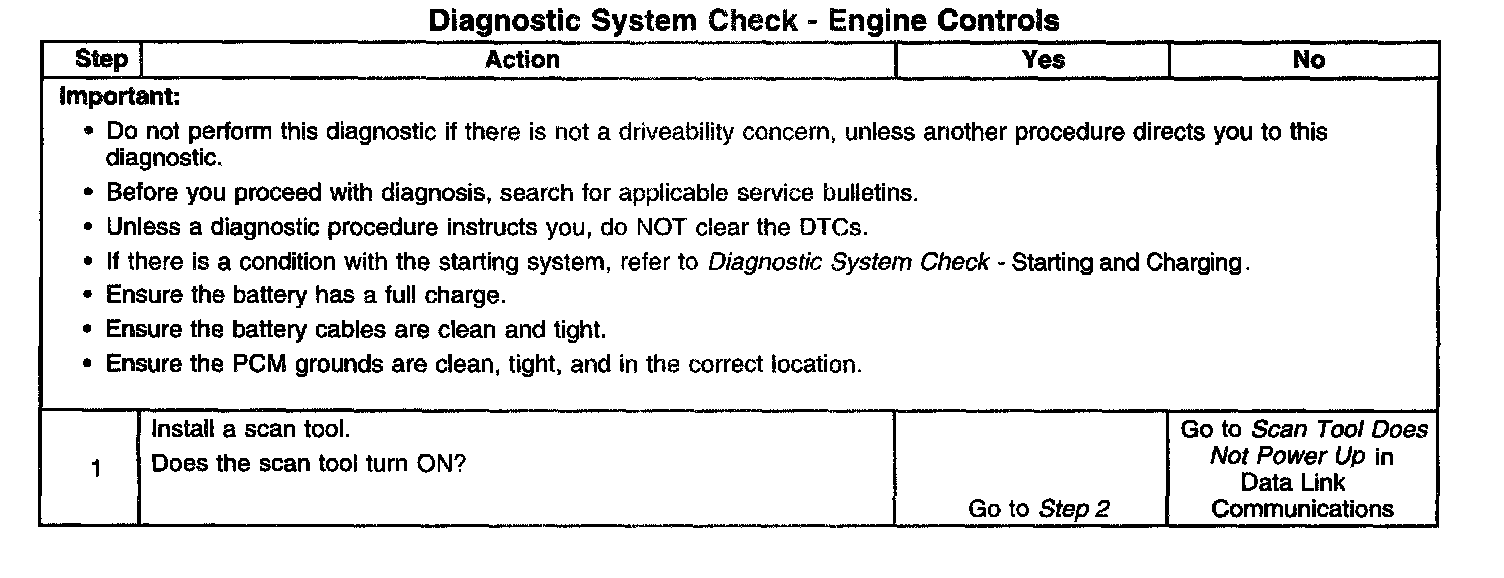 The Diagnostic System Check is an organized approach to identifying a condition that is created by a malfunction in the electronic engine control system. The Diagnostic System Check must be the starting point for any driveability concern. The Diagnostic System Check directs the service technician to the next logical step in order to diagnose the concern. Understanding, and correctly using the diagnostic table reduces diagnostic time, and prevents the replacement of good parts.